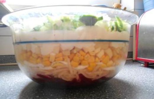Zutaten für Personen Rezept mit Bild: Vegetarischer Schichtsalat mit rote Bete Bild einstellen 350 gr. Rote Bete Konserve abgetropft 370 gr. Sellerie-Streifen Glas abgetropft 6 Eier 450 gr. Mais 2 A [...]