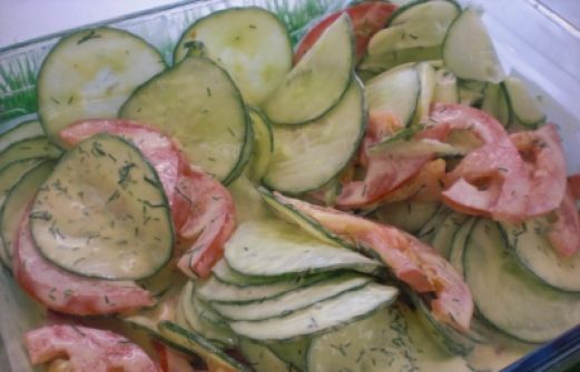 Menge Zutat 400 g Salatgurke in feinen Scheiben 200 g Tomaten in feinen Scheiben 200 g Kefir 4 gestr. TL fein gehackter Dill 1/2 gestr. TL milder Senf [...]
