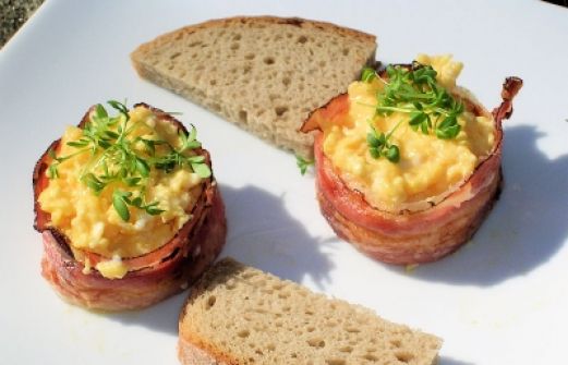 Menge Zutat 4 St Ei 6 St Streifen Frühstücksspeck 1 Bund frische Kräuter (zB Kresse) 1 Prise Salz (zum Nachwürzen) 1 Prise Pfeffer (zum Nachwürzen) [...]