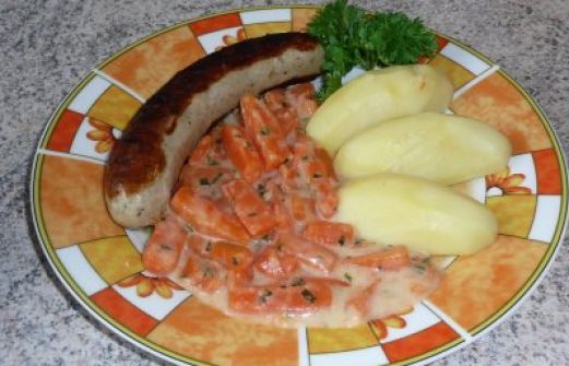 Zutaten für Personen Rezept mit Bild: Gemüse: Karotten mit Bratwurst und Salzkartoffeln Bild einstellen 1/2 kg Karotten 1/2 Ltr Brühe 1 Bund Petersilie 1 EL Speisestärke 100 ml Sahne Salz Pfef [...]