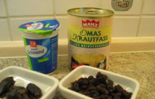 Zutaten für Personen Rezept mit Bild: Beilagen: Sauerkraut, orientalisch Bild einstellen 1 Ds. mildes Weinsauerkraut, mittlere Größe 1 Handvoll Rosinen 3 St. Datteln, kleingeschnitten 100 g Crème fraîche ode [...]