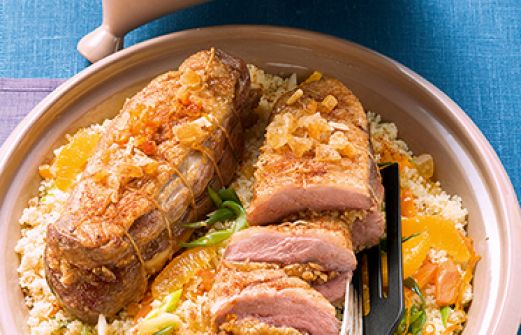 Gefüllte Entenbrust mit Orangen-Couscous Zutaten 2 EL Mandelstifte je 50 g Orangeat und kandierter Ingwer 4 Entenbrustfilets (je ca. 250 g) Salz Cayennepfeffer 40 g Butter 200 ml Entenfond (aus dem Glas) 200 ml Orangensaft 2 Orangen, davon 1 Bio-Orange 1 Möhre 3 Frühlingszwi [...]