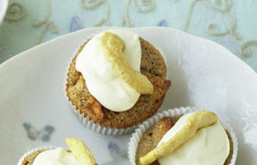 Apfel-Calvados-Cupcakes Zutaten 120 g getrocknete Apfelringe 175 ml Apfelsaft 100 g weiche Butter 60 g Zucker 3 Eier 150 g Hartweizengrieß 80 g gemahlene Walnüsse 2 gehäufte TL Backpulver 1 Prise Salz ½ TL Zimtpulver 100 ml Milch 250 g Crème double 2 Päckchen Vanillezuck [...]
