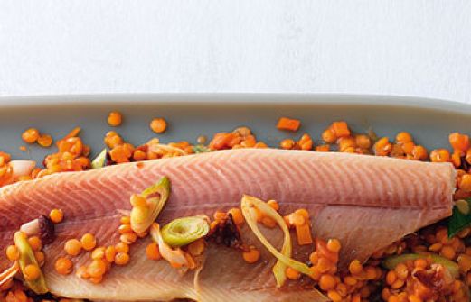 Räucherforelle mit Linsen Zutaten 2 Scheiben Frühstücksspeck (ca. 40 g) 1 EL Öl 2 Frühlingszwiebeln 50 g Lauch 50 g Möhre 100 g rote Linsen 2 EL Tomatenmark 300 ml Gemüsebrühe 2 EL Sahne 1-2 EL Rotweinessig Salz Pfeffer 2 geräucherte Forellenfilets (ohne Haut, ca. 240 [...]
