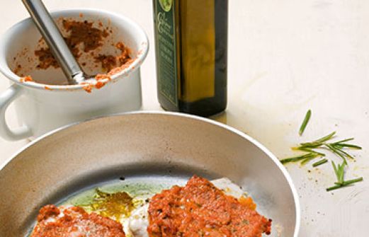 Schwert-Fisch mit Tomaten-Kruste Zutaten 2 Schwertfischsteaks (je ca. 150 g) 1 EL Olivenöl 1 TL abgeriebene Bio-Zitronenschale 3 getrocknete Tomaten in Öl (aus dem Glas) 1 Knoblauchzehe je 1 Zweig Rosmarin und Petersilie je 1 EL Pinienkerne und Semmelbrösel 1 reife Tomate Salz [...]