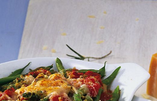 Überbackene grüne Bohnen mit Tomatensauce Zutaten 500 g grüne Bohnen Salz 400 g Tomaten 1 mittelgroße Zwiebel 2-3 Knoblauchzehen 2 EL Olivenöl 2 EL Tomatenmark 2 kleine Zweige frischer Rosmarin 1 EL Sardellenpaste Pfeffer 40 g Parmesan frisch gerieben guk:similarity-k [...]