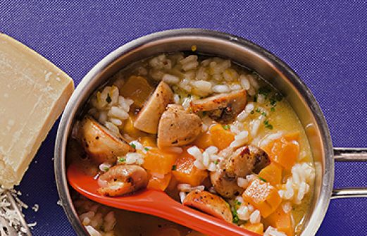 Kürbisrisotto Zutaten 400 g Kürbis (z.B. Muskatkürbis) 1 kleine Zwiebel 1 Knoblauchzehe 2 EL Olivenöl 200 g Risottoreis 6 EL trockener Weißwein 400 ml heiße Gemüsebrühe 125 g kleine weiße Champignons 1 EL Butter 1/2 Bund Schnittlauch 40 g frisch geriebener Parmesan Sal [...]