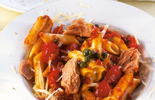 Penne mit Thunfisch Zutaten 200 g Penne Jodsalz 1 Knoblauchzehe 6 Cocktailtomaten 135 g Thunfisch naturell (aus der Dose) 1 EL Olivenöl 1 TL Kapern 2 EL Ajvar (Paprikapüree) Pfeffer 30 g Parmesan 2 EL gehackte Petersilie (wer mag) guk:similarity-keywords=""> 200 g P [...]