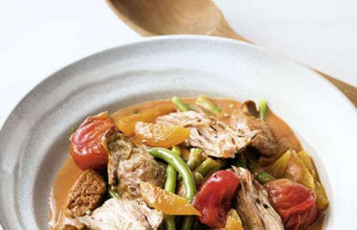 Lammtopf mit Bohnen Zutaten 2 Zwiebeln 3 Knoblauchzehen je 2-3 Zweige Rosmarin und Thymian 800 g Lammschulter (mit Knochen) Salz 3 EL Öl 1 EL Zucker 1 TL getrocknetes Bohnenkraut 150 ml trockener Rotwein 400 ml Lammfond (aus dem Glas) 3 Merguez (scharfe Lammwürstchen; ersat [...]