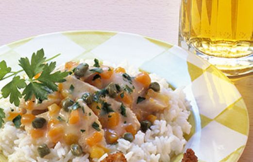 Hühnerfrikassee Zutaten 1 frisches küchenfertiges Suppenhuhn (etwa 1,2 kg) 1 Zwiebel 1 Lorbeerblatt 2 Nelken 1 Bund Suppengrün 10 Pfefferkörner Salz 2 Möhren 50 g Butter 4 EL Mehl 60 g Kapern 100 ml Weißwein (nach Belieben) 3 EL Zitronensaft 4 EL saure Sahne 3 EL geh [...]