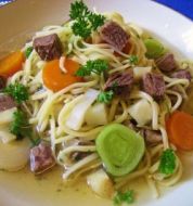 Nudelsuppe Zutaten 500 g Rinderknochen Salz 600 g Suppenfleisch (Tafelspitz) 1 Bund Suppengrün 2 Zwiebeln 3 getrocknete Chilischoten (nur für die, die's scharf mögen) Pfefferkörner 1 Bund Frühlingszwiebeln Pfeffer aus der Mühle 150 g Suppennudeln guk:similarity-keywords [...]