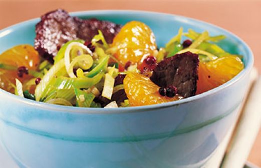 Rindfleisch mit Mandarinen Zutaten 600 g Rinderlende oder -filet 2 Stangen Lauch 1 Stück Ingwer (1-2 cm) 4-6 getrocknete Chilischoten 1 Dose Mandarinen (175 g Abtropfgewicht) 4 EL Öl 1 EL Sichuan-Pfeffer 2 EL Reiswein 4 EL Sojasauce 1/8 l Hühnerbrühe 1 TL Zucker Salz gu [...]