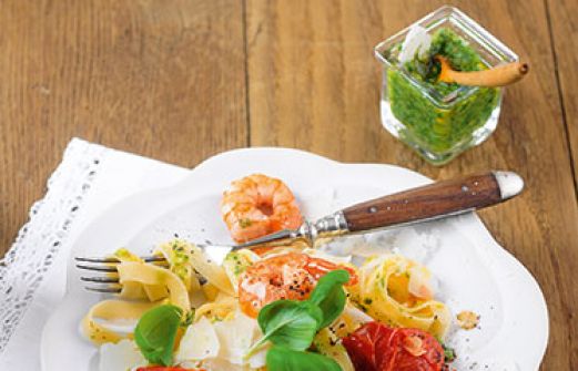 Tagliatelle mit Garnelen und Zitronenpesto Zutaten 30 g Haselnusskerne 2 Bund Basilikum 1 Bund Kerbel 3 Bio-Zitronen 2 Knoblauchzehen 60 g reifer Pecorino oder Parmesan 120 ml Distel- oder Rapsöl 1- 2 TL Honig Salz Pfeffer 250 g Kirschtomaten 250 g rohe Garnelen (küche [...]