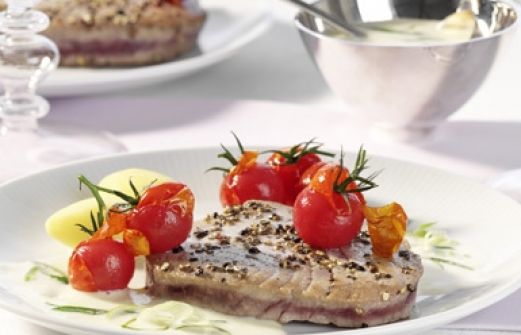 Menge Zutat 2 TL bunte Pfefferkörner 2 Thunfischsteaks à 150 g 1 unbehandelte Limette 2 Frühlingszwiebeln 1 TL Butter 150 ml Fis [...]