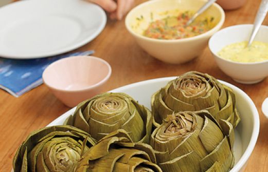 Artischocken mit dreierlei Saucen Zutaten 4 dicke, fleischige Artischocken Saft von 1 Zitrone Salz 1 ganz frisches Eigelb (Größe M, zimmerwarm, also mindestens 30 Minuten vorher aus dem Kühlschrank holen) 1 TL Dijon-Senf 150 ml Olivenöl 1 Bio-Zitrone 1/4 Bund Zitronenmelisse 1 [...]