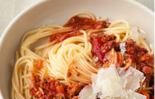 Spaghetti alla bolognese Zutaten 1 Knoblauchzehe 1 große Zwiebel 1 kleines Bund uppengrün 100 g Frühstücksspeck (Bacon) 2 EL Olivenöl 250 g Rinderhackfleisch 3 EL Tomatenmark 1 große Dose geschälte Tomaten (850 ml) 1/8 l Rotwein (oder Gemüsebrühe) 1-2 EL getrocknete italienis [...]