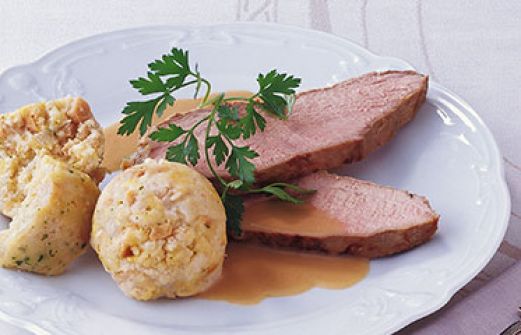 Kalbsbraten mit Semmelknödeln Zutaten 1 kg Kalbsbraten (z. B. Nuss oder Oberschale) Salz Pfeffer 2 EL Öl 150 ml trockener Weißwein (ersatzweise Kalbsfond) 250 ml Kalbsfond (Glas) 200 g Sahne 2 EL heller Saucenbinder 8-10 altbackene Brötchen (400 g) 1/4 l Milch 1 kleine Zwie [...]