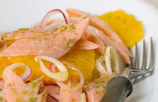Fenchel-Orangen-Salat mit Räucherforelle Zutaten 1 Zitrone 4 Orangen 2 rote Zwiebeln 2 Knollen Fenchel (unbedingt samt dem satten Grün) 5 EL Olivenöl 1-2 EL Anislikör (z. B. Pernod) 1-2 Prisen Zucker feines Meersalz frisch gemahlener schwarzer Pfeffer 2 geräucherte Lachsfore [...]