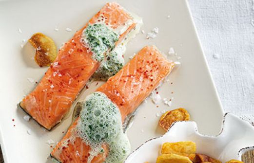 Lachs mit Kräuterschaum Zutaten 1 frisches Lachsfilet (ca. 600 g, Schwanzstück, mit Haut) Salz Pfeffer 2-3 Zweige Thymian 1 Bund Kräuter (z. B. Basilikum, Kerbel, Petersilie, Dill, Sauerampfer, ca. 100 g) 1 kleine Zwiebel 1 Kartoffel (ca. 100 g) 2 EL Butter 250 ml Gemüsebr [...]