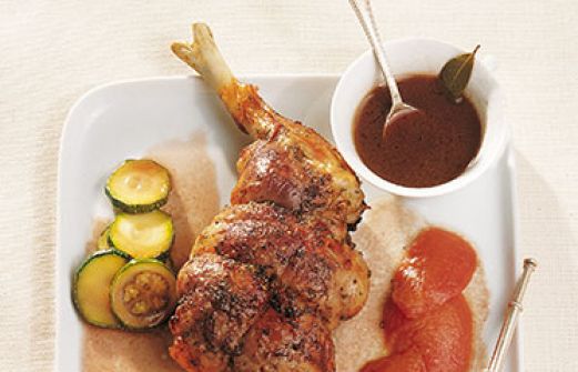 Lammkeule mit Gemüse Zutaten 1 Lammkeule (mit Knochen, etwa 2,5 kg) 4 Knoblauchzehen 2 EL Olivenöl Salz Pfeffer, frisch gemahlen je 1 EL gehackter Rosmarin und Thymian 2 Zwiebeln 2 Lorbeerblätter ½ l Rotwein ¼ l Kalbsfond 400 g Zucchini 400 g Tomaten 1 TL Maisstärke na [...]