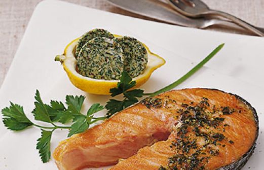 Lachs mit Würzbutter Zutaten ½ Bund Petersilie 1 Knoblauchzehe 2 TL körniger Senf 125 g weiche Butter Salz Pfeffer 1-2 TL Zitronensaft 4 Lachskoteletts (je 180-200 g) 2 EL Olivenöl guk:similarity-keywords=""> ½ Bund Petersilie , 1 Knoblauchzehe , 2 TL kö [...]