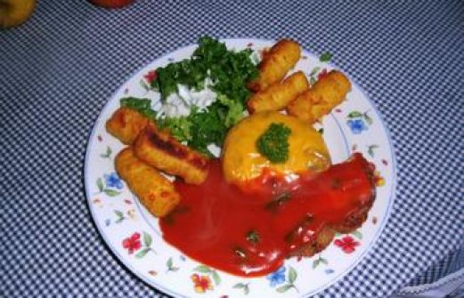 Zutaten für Personen Rezept mit Bild: Kotelett mit Käse überbacken mit Tomatensoße , Salat und Kroketten Bild einstellen 2 Kotelett paniert 2 Tomatenscheiben 2 Käsescheiben 10 Kroketten 1 Romanasalat [...]