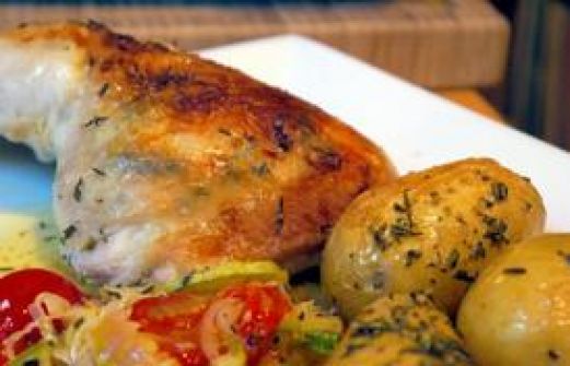 Zutaten für Personen Rezept mit Bild: Thymian-Zitronen-Hähnchen Bild einstellen 2 Hähnchenschenkel 6 kleine Kartoffeln 1 kleine Zucchini 1 rote Paprika 1 Handvoll Romana-Tomaten 1 Stange junger [...]