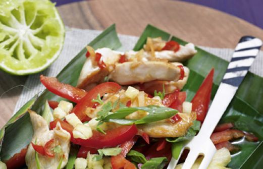 Hähnchensalat mit Ananas Zutaten 120 g Hähnchenbrustfilet 1/2 große rote Chilischote 1 kleine Knoblauchzehe 1 TL geröstetes Sesamöl 1 TL Honig 1/2 rote oder gelbe Paprikaschote 2 Frühlingszwiebeln 2 Scheiben frische Ananas (ca. 100 g) 2 TL neutrales Öl Salz 1/2 Bund Korian [...]