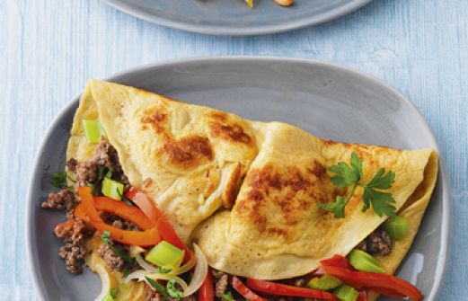 Gefüllte Omeletts mit Hackfleisch und Gemüse Zutaten 2 Eier 100 ml Milch 50 g Weizenmehl, Type 1050 Salz, Pfeffer frisch geriebene Muskatnuss 1 Zwiebel 1 rote Paprikaschote 1 Stange Staudensellerie 150 g Cocktailtomaten 3 TL Olivenöl 100 g mageres Rinderhackfleisch ½ TL [...]