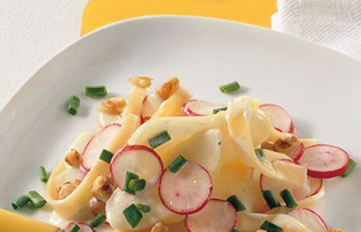 Apfel-Käse-Salat Zutaten 1 Bund Radieschen oder 250 g Salatgurke 1 EL Walnusskerne 1 Bund Schnittlauch 2 saftige Äpfel 200 g Hartkäse (Emmentaler, Bergkäse, mittelalter Gouda; in Scheiben oder am Stück) 1 EL Zitronensaft oder Essig 2 EL saure Sahne Salz Pfeffer 1 TL Apfeldic [...]