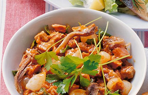 Fleischsalat mit Tomaten-Dressing Zutaten 350 g gekochtes Rindfleisch 150 g Perlzwiebeln (aus dem Glas) 8 Sardellenfilets in Salzlake 2 EL gehackte Petersilie 5 EL Tomatenpüree (aus dem Päckchen oder Glas) 2 EL Weißweinessig 1 TL scharfer Senf 1-2 Prisen Zucker Salz Pfeffer [...]