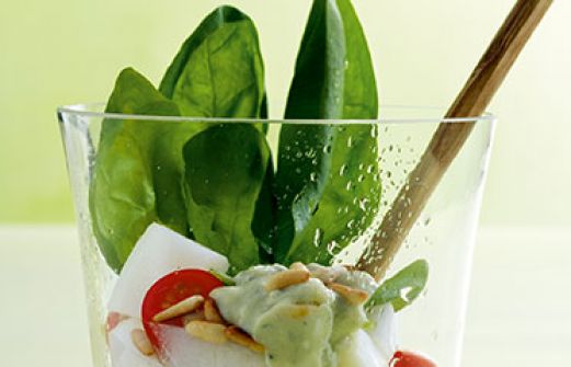 Tomaten-Melonen-Salat mit Gorgonzoladressing Zutaten 1/2 Honigmelone (etwa 500 g) 250 g Cocktailtomaten 1 Bund Rucola oder 1 Handvoll junger Spinat 60 g Gorgonzola 60 g Sahne 1 1/2 EL Apfel- oder Birnenessig 3 EL Olivenöl Pfeffer und Salz 2 EL Pinienkerne guk:similarity-k [...]