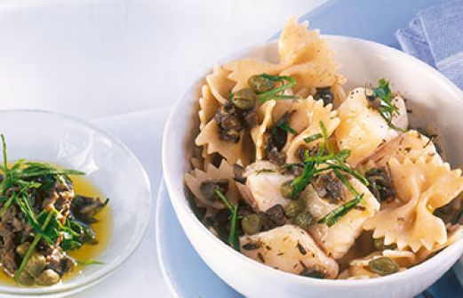 Rotbarsch mit Oliven-Kapern-Sauce Zutaten 50 g entsteinte schwarze Oliven 1/2 TL mittelscharfer Senf Salz Pfeffer 2 EL Zitronensaft 1 Msp. abgeriebene Zitronenschale 3 EL Olivenöl 2 EL Kapern 1 EL gehackte Petersilie 1/2 TL Fenchelsamen 400 g Rotbarschfilet 150 g Weizen-Vo [...]