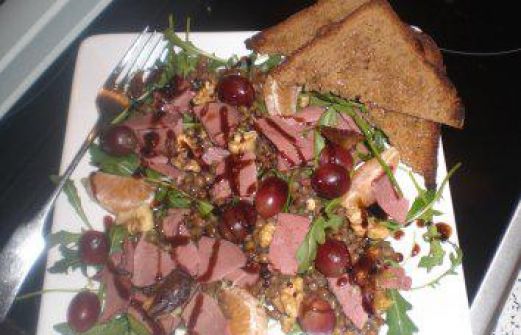 Zutaten für Personen Rezept mit Bild: Salatteller mit Ente Bild einstellen 12 Sch geräucherte Entenbrust 1 Tasse gekochte kleine braune Linsen 1 Mandarine, einige Weintrauben 1 Dattel 5 halbe Walnußkerne [...]
