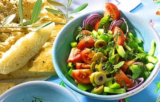 Menge Zutat 1/2 g Salatgurke 2 grüne Paprikaschoten 400 g Tomaten 2 g rote Zwiebeln 1 Bund Minze 2 Btl KNORR Salatkrönung Griechisc [...]