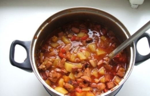 Menge Zutat 50 g gew.Speck 1 kg Kartoffeln 4 St Zwiebeln 1 EL Tomatenmark 4 Knoblauchzehen 1 TL Paprika 1 Pri [...]