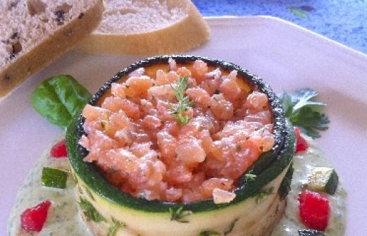Lachstatar im Zucchinimantel Zutaten 2 Zucchini, mittelgross und lang Olivenöl zum Anbraten 2 Zweige Thymian ------- das Tatar: 400 g Lachsfilet, sehr frisch, mit Haut 75 g geräucherte Lachsforellenscheiben oder Räucherlachs 1 kleine Schalotte, fein gewürfelt 1 Tl Zitronenzesten [...]