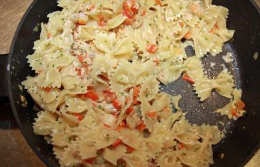 Zutaten für Personen Rezept mit Bild: Farfalle in Lachs-Garnelen-Rahm Bild einstellen 400 gr. Farfalle oder andere Nudeln 2 rote Paprikaschoten 3 EL Olivenöl 0.5 TL Knoblauch gehackt 250 gr. Garnele frisch [...]