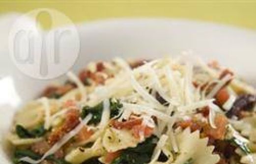 Portionen : 4 450 g Farfalle 170 g frischer Blattspinat 85 g frische Basilikumblätter 120 ml extra natives Olivenöl 3 Knoblauchzehen, gehackt
