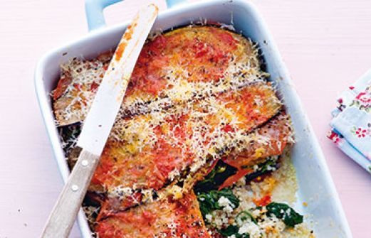 Spinat-Auberginen-Lasagne Zutaten 50 g Parmesan 1 kleine Aubergine 2 EL Olivenöl 300 g TK-Blattspinat 4 Tomaten 1/2 TL getrockneter Rosmarin 1/2 Tl getrockneter Thymian Salz Pfeffer 2 EL mildes Ajvar 60 Instant-Couscous frisch geriebene Muskatnuss guk:similarity-key [...]