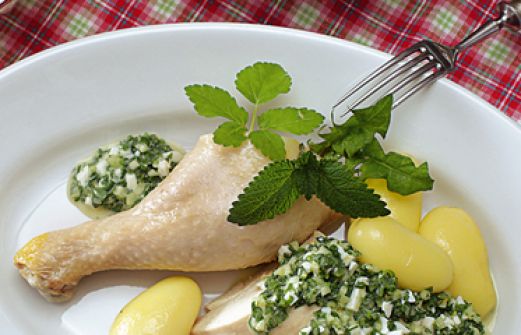 Pochiertes Huhn mit Eiersauce Zutaten 1 Bund Suppengrün 1 Zwiebel 2 Wacholderbeeren 1 TL schwarze Pfefferkörner 2 Lorbeerblätter Salz 1 Poularde (etwa 1,4 kg) 2 Eier (M) 1 kleine Salatgurke (etwa 150 g) 100 g gemischte Frühlingskräuter (z. B. Löwenzahn, Bärlauch, Zitronenmeli [...]