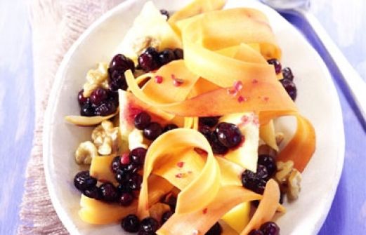 Menge Zutat 4 TL Ahornsirup Saft von 1 Zitrone 1 Prise Salz geschroteter rosa Pfeffer 2 TL Walnussöl 200 g Blaubeeren (tiefgefr [...]