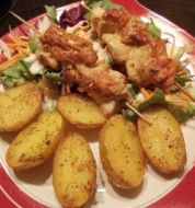 Rosmarinkartoffeln Zutaten 2 kg Kartoffeln 3 - 4 Eßlöffel Olivenöl 2 Zweige Rosmarin Gewürze Salz, Pfeffer, Grillgewürz, Paprikapulver 2 Becher Kräuterquark von Aldi 1 Becher Sourcreme 3 Scheiben Getrocknete Tomaten 2 saure Gurken 2 Eßlöffel süß-saurer Chili Ketchup 1 Zehe K [...]