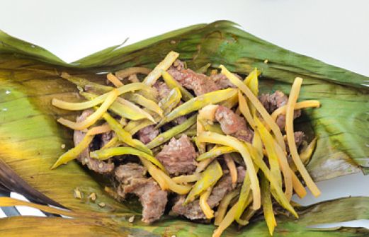 Asia-Rind im Bananenblatt Zutaten 400 g Rinderhüfte 1 Stück Zitronengras (ca. 3 cm) 1 Stück Ingwer (ca. 1 cm) 2 EL Sesamsamen 2 EL Sojasauce 200 g Zuckerschoten 100 g Bambussprossen (aus Glas oder Dose) 1 Bananenblatt guk:similarity-keywords=""> 400 g Rinderhüfte , 1 [...]