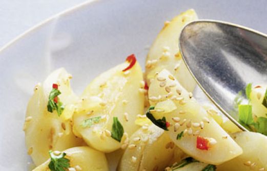 Topinambur mit Sesam und Koriander Zutaten 1 kg gleich große Topinambur-Knollen 1 Zwiebel 1 Knoblauchzehe 1 rote Chilischote 1 Bund Koriandergrün 1 gehäufter EL ungeschälte Sesamsamen 3 EL Sonnenblumenöl 100 ml Gemüsebrühe Salz guk:similarity-keywords=""> 1 kg gleich g [...]