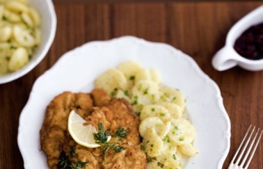 Wiener Schnitzel mit Kartoffelsalat Zutaten 750 g Salatkartoffeln Salz 1 Zwiebel 4-5 EL Sonnenblumenöl 2 EL Weißweinessig 150 ml Geflügelbrühe 1 TL mittelscharfer Pfeffer 1/2 Bund Schnittlauch 4 Kalbschnitzel (à ca. 120 g) 2 Eier ca. 50 g Mehl 150 g Semmelbrösel (am be [...]