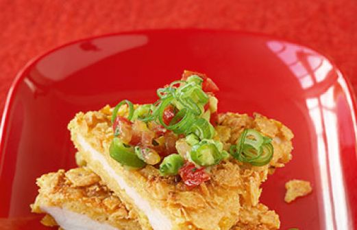 Tortilla-Schnitzel mit Avocado-Salsa Zutaten 2 Putenschnitzel (à ca. 125 g) Salz Pfeffer 30 g scharfe Tortilla-Chips 2 EL Semmelbrösel 2 EL Mehl 1 Ei 2 EL Öl 1 reife Avocado 2 EL Zitronensaft 3 Frühlingszwiebeln 200 g Tomaten einige Spritzer Tabasco guk:similarity-k [...]