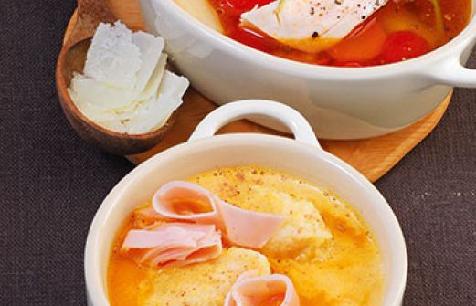 Möhrensuppe mit Nockerln und Pute Zutaten 2 zimmerwarme Eier (Größe M) 100 g weiche Butter 120 g Instant-Polentagrieß 6 EL frisch geriebener Parmesan Salz Pfeffer 300 g Möhren 1 Zwiebel 1 Birne 1 TL Tomatenmark 2 l Gemüsebrühe (Instant) 8 Scheiben geräucherte Putenbrust [...]