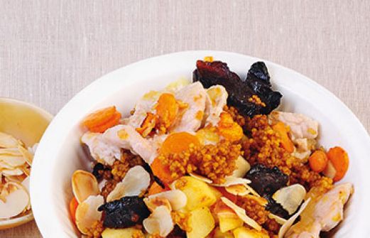 Gewürz-Couscous mit Putenstreifen Zutaten 1 Zwiebel 1 Knoblauchzehe 1 Möhre 1 Apfel 100 g Trockenpflaumen 300 g Putenbrust 2 EL Öl 1 EL Zucker je 1 TL gemahlener Koriander und Kurkuma 1 Msp. Zimtpulver Salz 100 g Couscous 30 g Mandelblättchen 1/4 l heiße Hühnerbrühe ( [...]