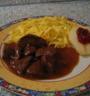 Zutaten für Personen Rezept mit Bild: Hirschgulasch in Preiselbeer-Sahne-Soße mit Herzoginkartoffeln und Rotkraut Bild einstellen 1 kg Hirschgulasch 250 g Champignons braun 200 g Schalotten 2 Loorbeerblät [...]